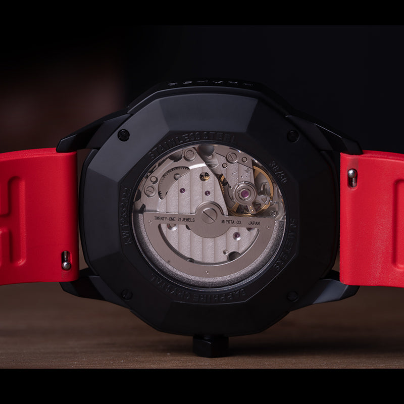Turn the watch over and you’ll find the soul of Black Antico . the Japanese MIYOTA 8217 movement, visible through its transparent case back. A rare glimpse into the mechanics that drive accuracy and reliability, housed in a body built to endure.