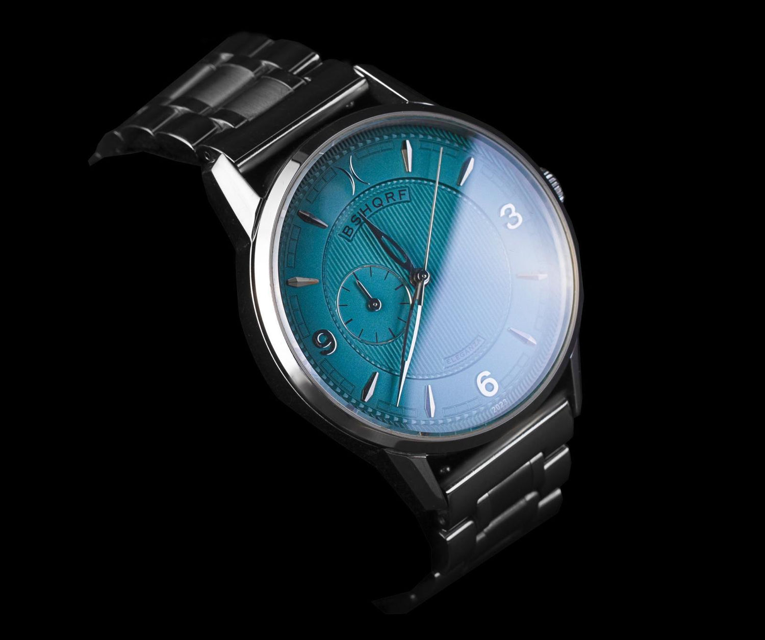 Crafted from 316L stainless steel with a dome-shaped sapphire crystal, the Eleganza Tiffany showcases the legendary Miyota 8217 automatic movement through its open caseback. Its bold Tiffany-blue dial stands as a modern icon of elegance.
